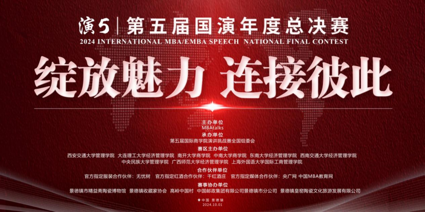 2024年10月1日至10月4日,由中国知名管理精英分享平台MBAtalks主办的第五届国际商学院演讲挑战赛(简称“国演赛”)全国总决赛在景德镇市成功举行。此次赛事吸引了来自上海交通大学、中山大学、南开大学、复旦大学、西安交通大学、武汉大学、兰州理工大学等全国120余所商学院/管理学院优秀(E)MBA人参与赛事活动,共同展示演讲风采,争夺荣誉。